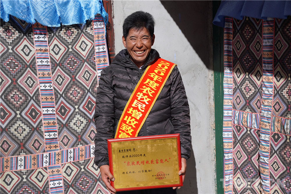勞動致富的桑杰巴珠。他曾經(jīng)是享受國家補助的一般貧困戶。為了早日摘掉貧困帽子,自2019年開始,他先后貸款5萬元購買拖拉機,在工地上搞運輸;參加了涂裝工、抹灰工培訓班,以技術(shù)求創(chuàng)收;在拉薩、澤當承包工地人工。艱辛的努力收獲了香甜的碩果,如今的桑杰巴珠日工資最低300元;2020年帶動本村12人就業(yè),共創(chuàng)收達48萬多元。他的大女兒米瑪卓瑪于2018年考上了湖北理工學院漢語文專業(yè),小女兒拉巴曲珍考上了山南完中,曾經(jīng)的困難戶華麗轉(zhuǎn)身成為小康人家。