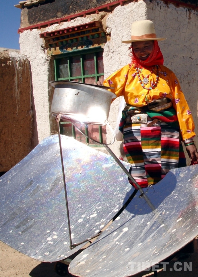 圖為這是藏北申扎縣牧民群眾在使用太陽(yáng)能灶燒水煮肉 唐召明提供,2005年10月13日攝