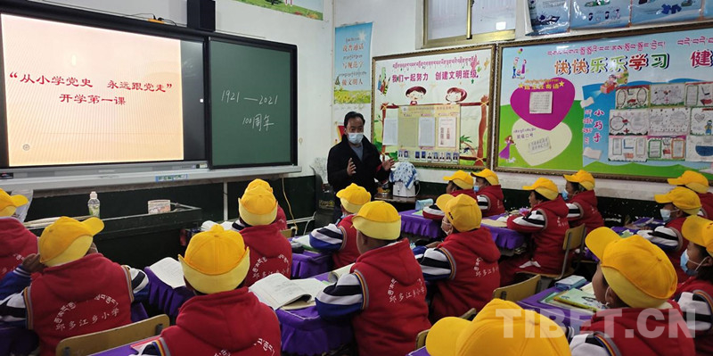圖為山南市曲松縣邱多江鄉(xiāng)小學(xué)開(kāi)展“從小學(xué)黨史 永遠(yuǎn)跟黨走”開(kāi)學(xué)第一課活動(dòng)