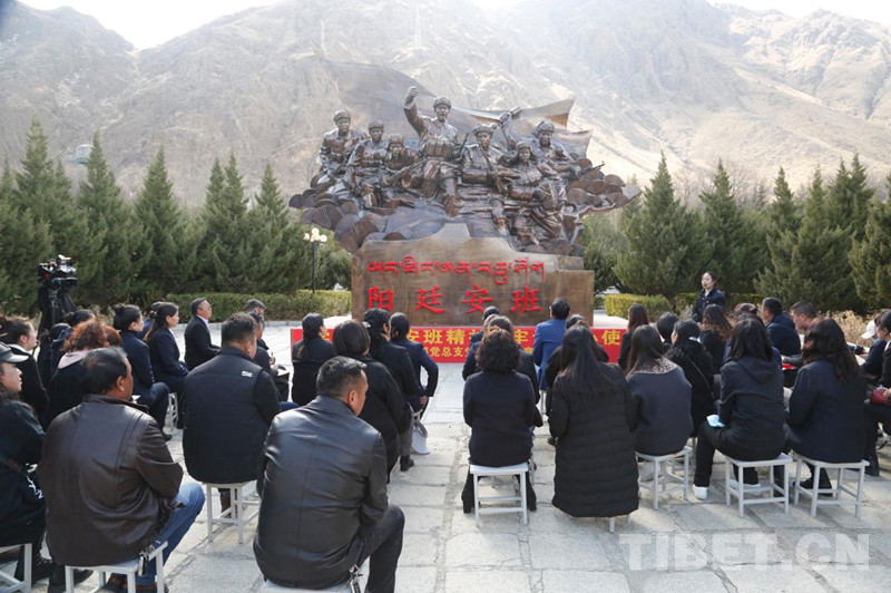 圖為山南市黨員干部在“陽(yáng)廷安班”雕塑前聆聽(tīng)英雄事跡
