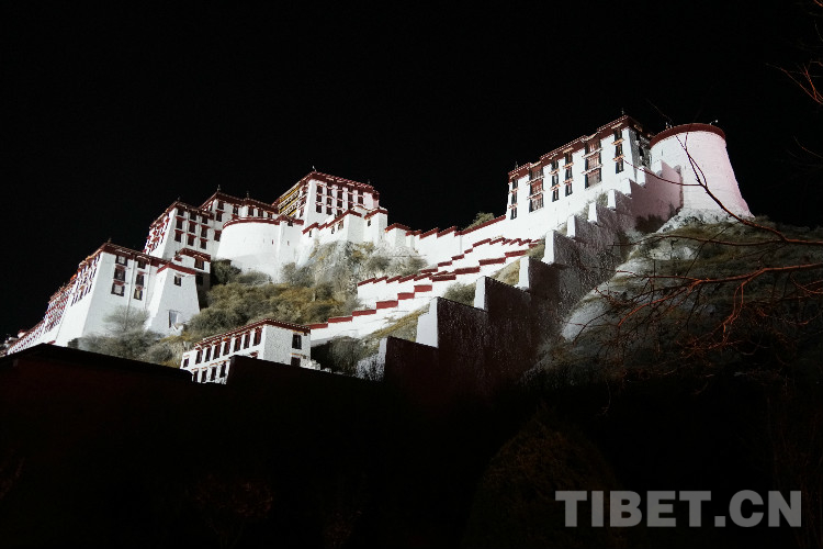 圖為布達拉宮廣場東側(cè)湖面處的夜景