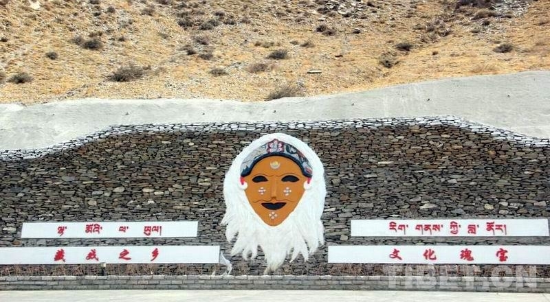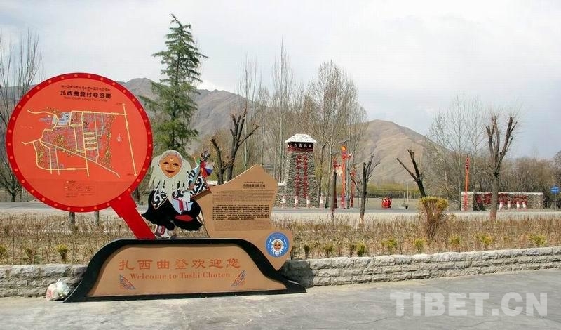 圖為扎西曲登社區(qū)引以為豪的“藏戲第一村”標志 攝影:劉莉