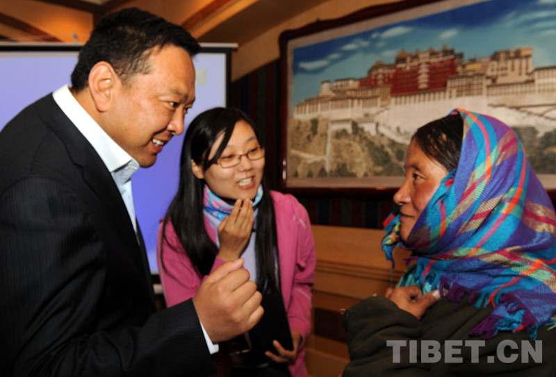 這是時任班戈縣縣委書記巴塔(左)與該縣脖子下切除巨大腫瘤、剛從北京治療回來的牧女斯求卓瑪交談(唐召明2011年8月16日攝)