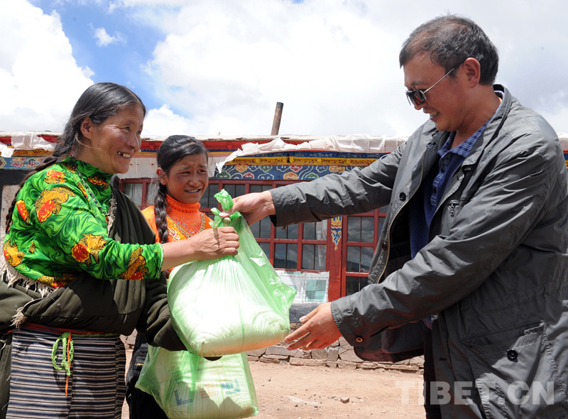 這是時任班戈縣副縣長的李正斌看望曾罹患巨大腫瘤的牧女斯求卓瑪,為她送去糧油等慰問品(唐召明2012年8月3日攝)