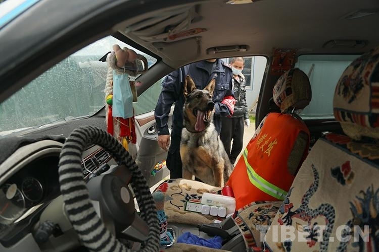 圖為西藏亞東出入境邊防檢查站警犬“黑崽”查控車輛 攝影:李錦輝