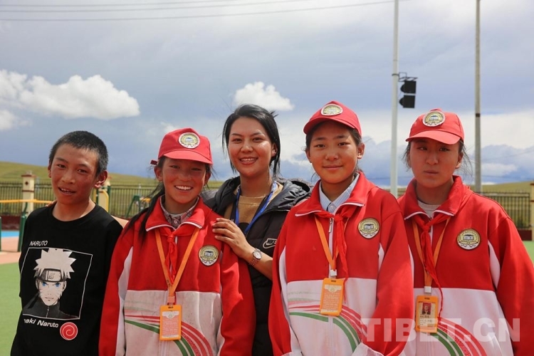 圖為西藏自治區(qū)那曲市色尼區(qū)杭嘉中學(xué)英語老師旦增卓瑪(左三)與學(xué)生們合影 攝影:吳建穎