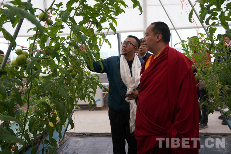 班禪走入蔬菜園、花卉園、熱帶植物園等溫室園區(qū),不時(shí)俯身仔細(xì)查看農(nóng)作物長勢。得知溫室內(nèi)竟種有百香果,班禪高興地說道:“百香果可是熱帶植物,能在那曲海拔這么高的地方種出來,很不容易!”在蔬菜園,班禪打開種植擋板,聽取無土栽培種植技術(shù)介紹,詳細(xì)詢問營養(yǎng)液噴灑時(shí)間、頻率等情況,點(diǎn)頭表示肯定。