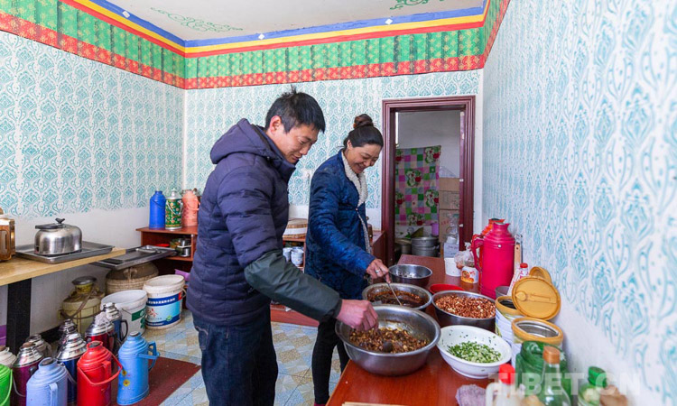 圖為楊松(左)和桑姆(右)夫妻倆正在餐館內(nèi)準(zhǔn)備飯菜 攝影:趙耀