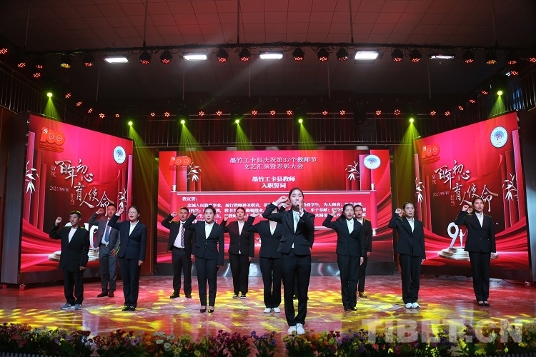 老前輩們的諄諄教誨,激勵(lì)著莘莘學(xué)子健康成長。他們勤勤懇懇做事、踏踏實(shí)實(shí)做人的優(yōu)良作風(fēng),也讓青年教師頗受觸動(dòng)。墨竹工卡縣今年新入職的13位教師走上舞臺,舉起右手,面對墨竹工卡縣各族各界代表及師生代表許下他們的鏗鏘誓言。