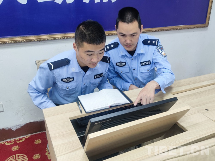 圖為劉華強(qiáng)(右)正在指導(dǎo)新警李東洪進(jìn)行邊檢業(yè)務(wù)學(xué)習(xí) 攝影:尼瑪云丹