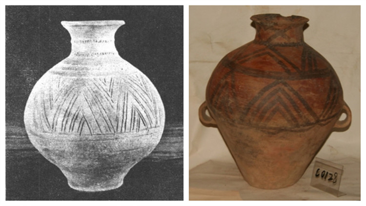 左圖為卡若遺址出土的陶罐 圖片翻拍自《昌都卡若》考古發(fā)掘報(bào)告;右圖為甘肅馬家窯文化三角折線紋彩陶壺 圖片來(lái)源于馬家窯文化官網(wǎng)