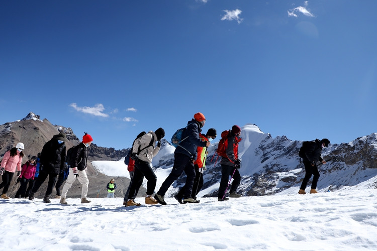 楊女士進藏已有半月,在專業(yè)人士的協(xié)助下她第一次近距離接觸了冰雪世界,并攀登到了海拔5600米的地方?!敖裉煳覜]有高原反應,帶的氧氣也沒用。”在雪山上楊女士的興奮之情溢于言表。