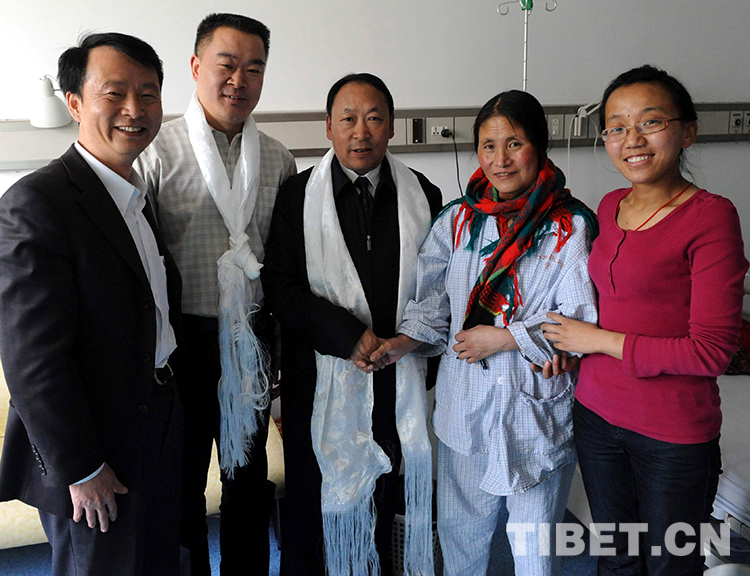 這是時(shí)任全國婦聯(lián)副主席甄硯(右一)受時(shí)任十一屆全國人大常委會(huì)副委員長(zhǎng)陳至立委托,到北京口腔醫(yī)院看望斯求卓瑪,并送來慰問金(唐召明2010年4月14日攝)