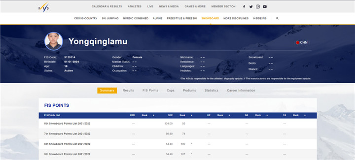 圖為國(guó)際雪聯(lián)官網(wǎng)運(yùn)動(dòng)員擁青拉姆介紹
