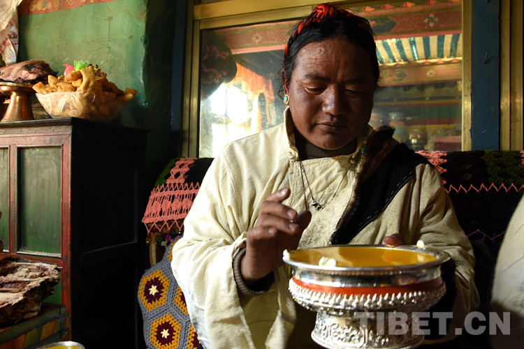 中國(guó)西藏網(wǎng)訊 3月3日,2022年藏歷水虎新年的大年初一,西藏自治區(qū)日喀則市薩迦縣雄麥鄉(xiāng)嘎白村,各族群眾在歡樂(lè)祥和的氛圍中歡度傳統(tǒng)佳節(jié)。一大早,嘎白村“夏林”一家人穿上節(jié)日的盛裝,向掛在客廳的領(lǐng)袖像敬獻(xiàn)哈達(dá)。隨后,晚輩向長(zhǎng)輩敬茶敬酒,幸福美滿的一家人圍坐在一起,一邊吃東西一邊聊家常,家里洋溢著和諧快樂(lè)、幸福美好的節(jié)日氣氛。(中國(guó)西藏網(wǎng) 記者/拉姆)