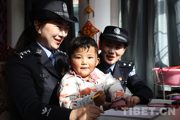 圖為聶拉木出入境邊防檢查站女民警為康珠小朋友輔導(dǎo)寫字并為其送上藏歷新年祝福 攝影:索朗次仁