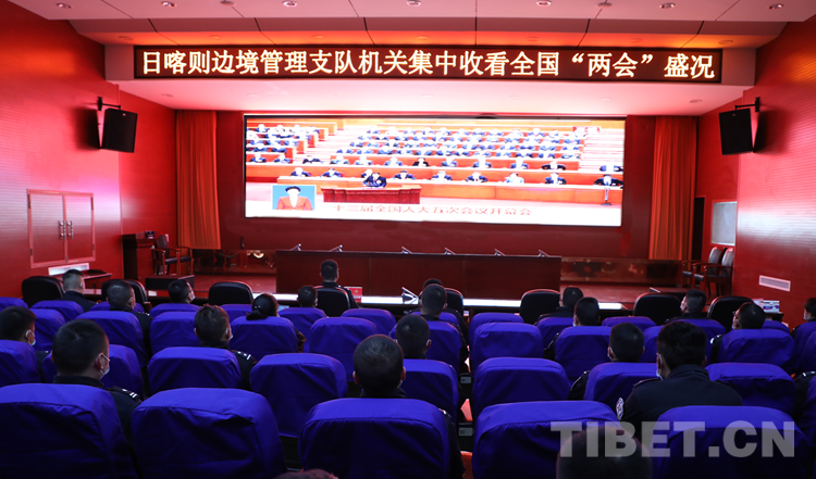 圖為日喀則邊境管理支隊機關(guān)民警收看兩會