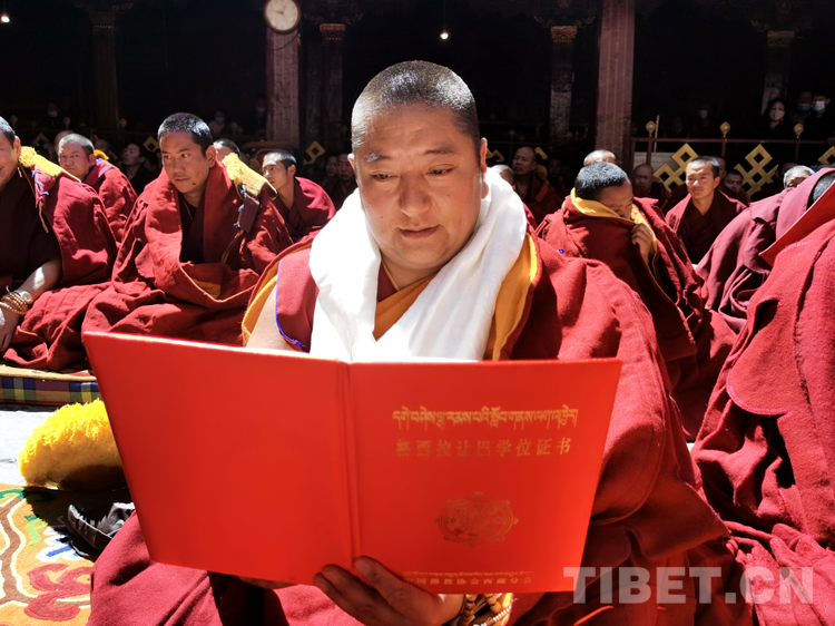 活動(dòng)現(xiàn)場,西藏自治區(qū)人民政府副秘書長馬立柱代表西藏自治區(qū)人民政府向獲得學(xué)位的考僧贈(zèng)送五彩緞、干果、袈裟和禮金;西藏自治區(qū)宗教局副局長達(dá)娃窮達(dá)向參加答辯活動(dòng)的僧人發(fā)放布施;中國佛教協(xié)會(huì)西藏分會(huì)常務(wù)副會(huì)長、西藏佛學(xué)院院長珠康?土登克珠致賀詞,并代表班禪額爾德尼?確吉杰布會(huì)長向獲得學(xué)位的考僧獻(xiàn)哈達(dá)、頒發(fā)學(xué)位證書。