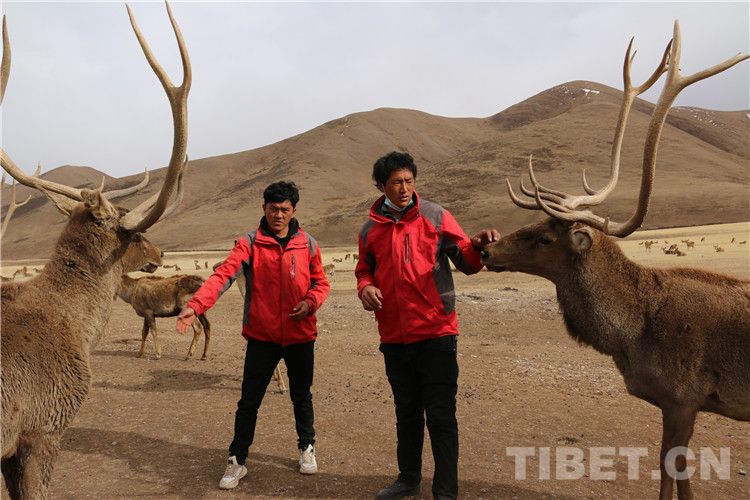 圖為向秋拉姆的兒子白瑪澤旺和仁青澤培給馬鹿喂食芫根