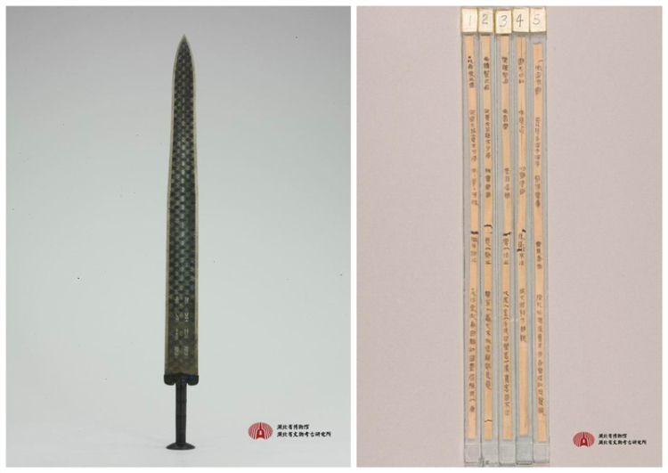 圖為湖北省博物館的兩件鎮(zhèn)館之寶:左為歷經(jīng)2500余年依然寒光閃閃、毫無銹蝕的“天下第一劍”——越王勾踐劍,右為云夢(mèng)睡虎地秦簡(jiǎn) 圖片來源:湖北省博物館網(wǎng)站
