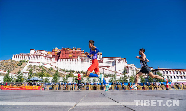 圖為拉薩半程馬拉松比賽中運動健兒從布達拉宮前飛奔而過 攝影:趙耀