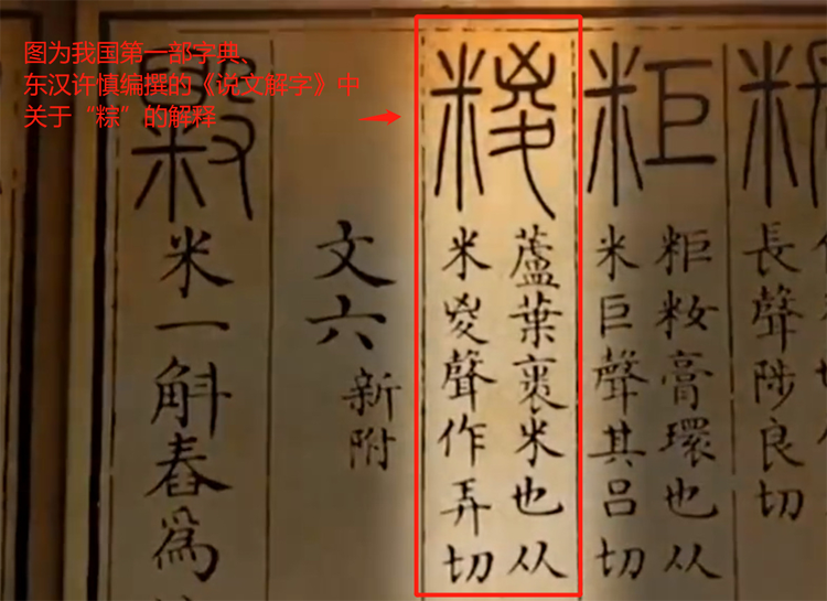 關(guān)于粽子,比較早的文字記載,在距今近2000年前,由東漢學(xué)者許慎編纂的我國第一部真正意義上的字典《說文解字》中可以找到——“糉,蘆葉裹米也”。這個(gè)記載言簡意賅地說明了制作粽子的原料和方法?!凹F”字就是我們現(xiàn)在使用的“粽”字。