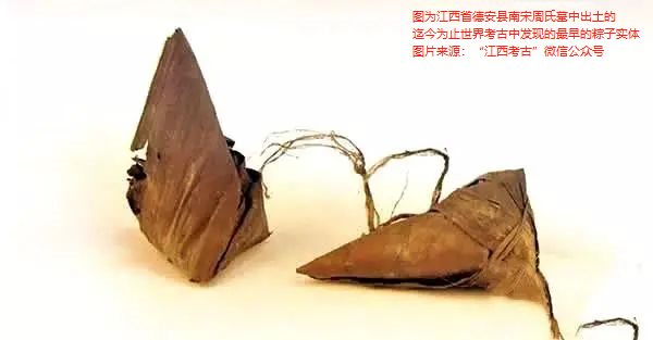 1988年,在江西省德安縣的南宋周氏墓中出土了迄今為止世界考古中發(fā)現(xiàn)的最早的粽子實(shí)體。有趣的是,開棺時(shí),工作人員發(fā)現(xiàn),墓主的手上拿著一根桃木枝,而桃木枝上掛著的,赫然是兩個(gè)實(shí)體粽子。用粽子作陪葬品很少見,據(jù)考古專家分析,墓主逝去于四月初十,大殮正值端午節(jié)前,可能生前愛吃粽子,所以就作為了陪葬品。據(jù)碑文記載,墓主周氏葬于公元1274年,所以,這是一對(duì)穿越了近750年時(shí)光來到我們面前的粽子。這對(duì)粽子呈菱角形,長6厘米、寬3厘米,外皮為粽葉,用天然蘆葦葉麻線捆扎,制作手法和材料與我們現(xiàn)在的粽子非常相近。這對(duì)珍貴的南宋粽子目前保存在江西省德安縣博物館。
