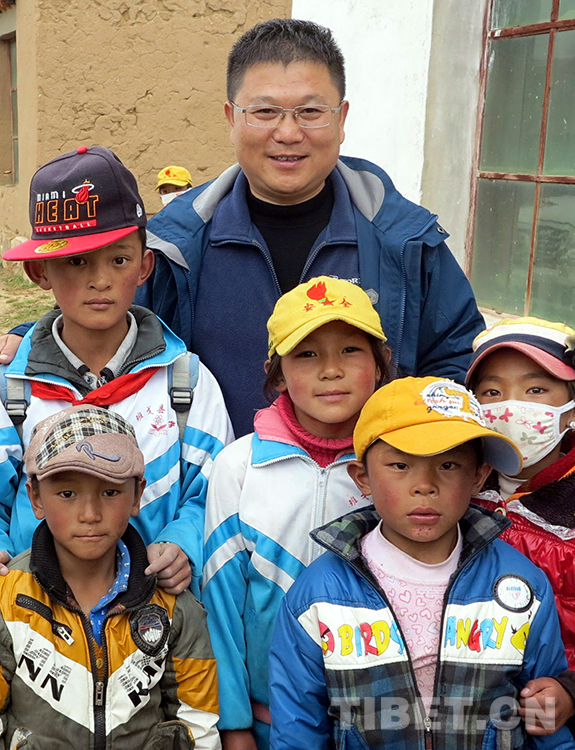 這是中國(guó)石化援藏干部王鵬雁與班戈縣小學(xué)的學(xué)生們合影留念(扎西2013年8月29日攝)