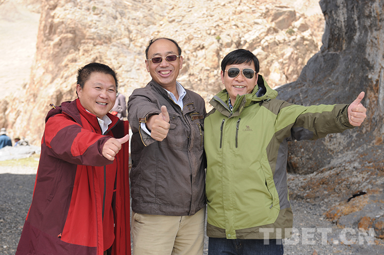 這是中國(guó)石化援藏干部王鵬雁(左)與一同援藏的常務(wù)副縣長(zhǎng)王飛(右)及來(lái)采訪的新華社記者唐召明(中)合影留念(王琪2015年5月20日攝)