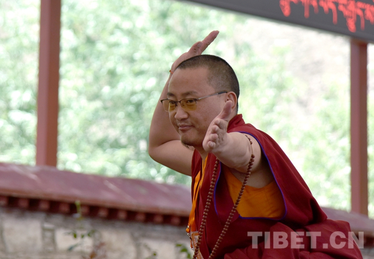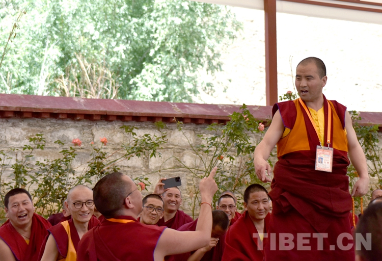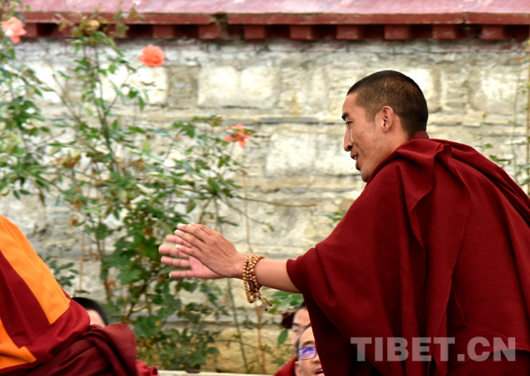 中國西藏網訊 身穿絳紅色袈裟,坐者仔細聆聽、站立者臂套念珠、迸出佛學妙語;圍觀者不時大笑……這是6月21日下午記者在西藏佛學院辯經場看到的“唇槍舌戰(zhàn)”。