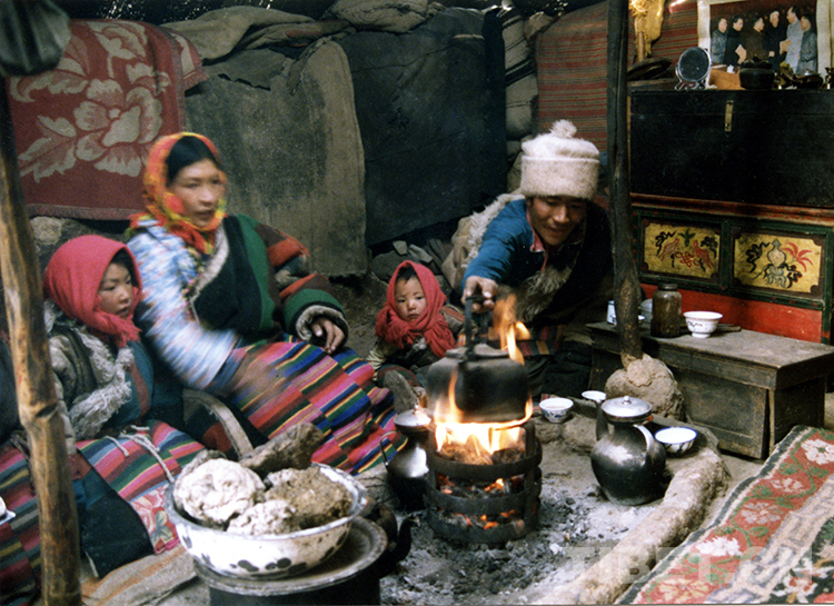 這是文部辦事處(現(xiàn)尼瑪縣)一戶(hù)牧民人家在帳篷里用牛糞取暖燒茶(唐召明1989年12月攝)