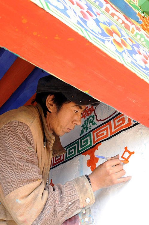 這是尼瑪縣文部鄉(xiāng)南村一戶(hù)人家請(qǐng)來(lái)畫(huà)師為自家安居新房進(jìn)行室內(nèi)彩繪(唐召明2009年攝)