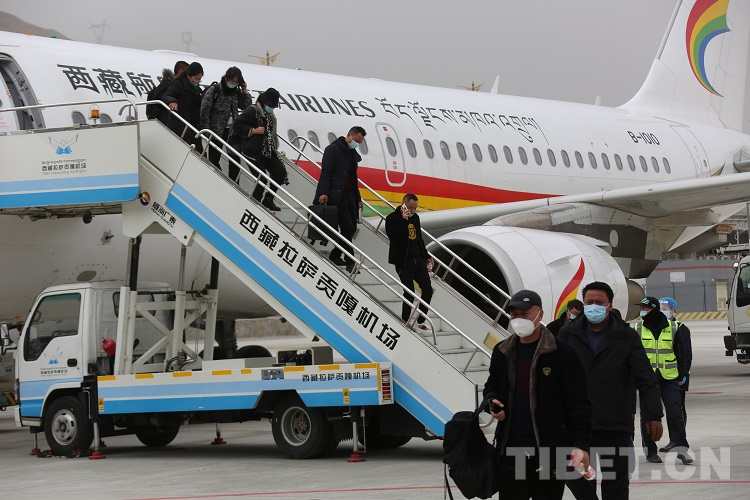 圖為飛機安全抵達拉薩貢嘎機場后乘客有序走下飛機 攝影:王佳豪