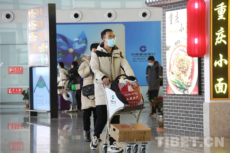 圖為在拉薩貢嘎機場內(nèi)旅客攜帶西藏特產(chǎn)準備登機 攝影:王佳豪