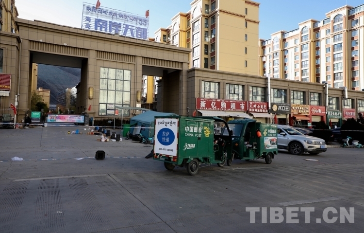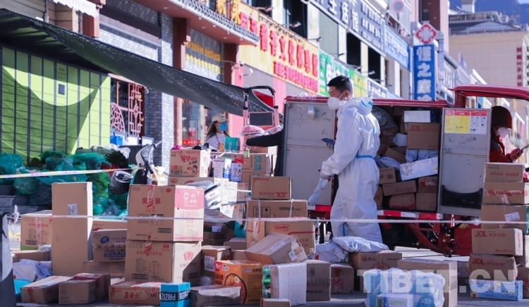 中國西藏網(wǎng)訊 隨著拉薩市疫情防控形勢整體持續(xù)向好,目前拉薩市郵政快遞業(yè)在落實好常態(tài)化疫情防控工作的基礎(chǔ)上,正有序復(fù)工復(fù)產(chǎn)。圖為快遞員無接觸配送快遞 攝影:賈華加(中國西藏網(wǎng) 記者/賈華加)