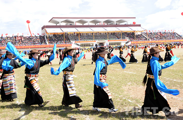 這是參加賽馬會(huì)的牧民群眾在新建的那曲民族體育賽馬場跳起大型“鍋莊”舞(唐召明2013年8月10日攝)