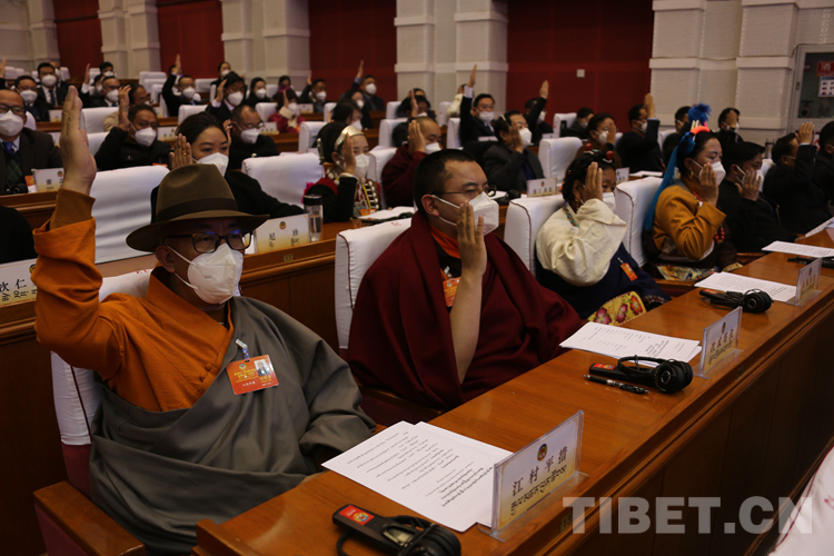 圖為政協(xié)委員舉手表決通過(guò)政協(xié)第十二屆西藏自治區(qū)委員會(huì)第一次會(huì)議選舉辦法,總監(jiān)票人、監(jiān)票人名單 攝影:王佳豪