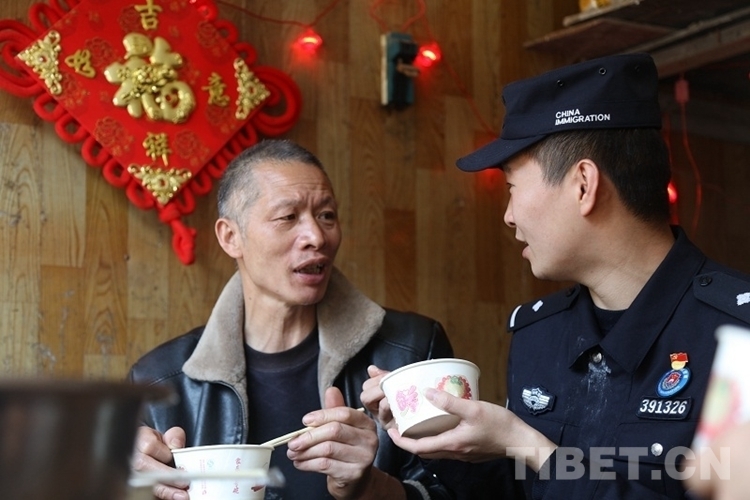 圖為民警為工人們盛湯圓,大家其樂(lè)融融 攝影:索朗次仁