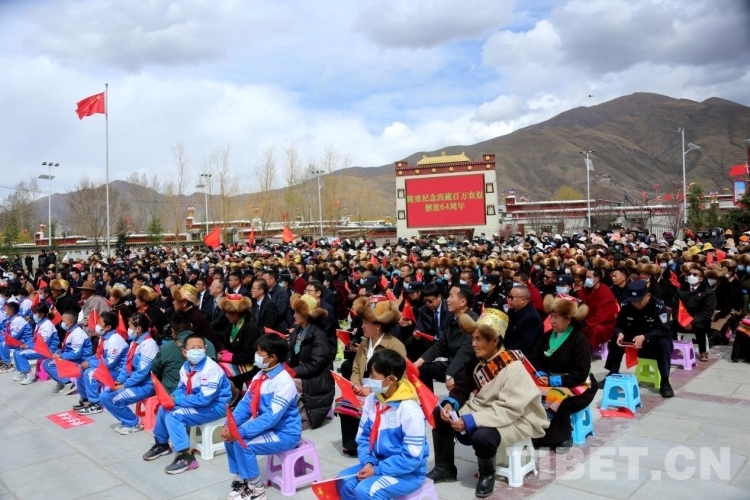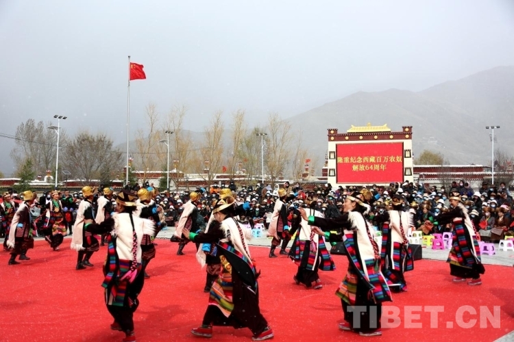圖為各界代表和克松群眾慶祝西藏百萬農(nóng)奴解放64周年 攝影:王佳豪