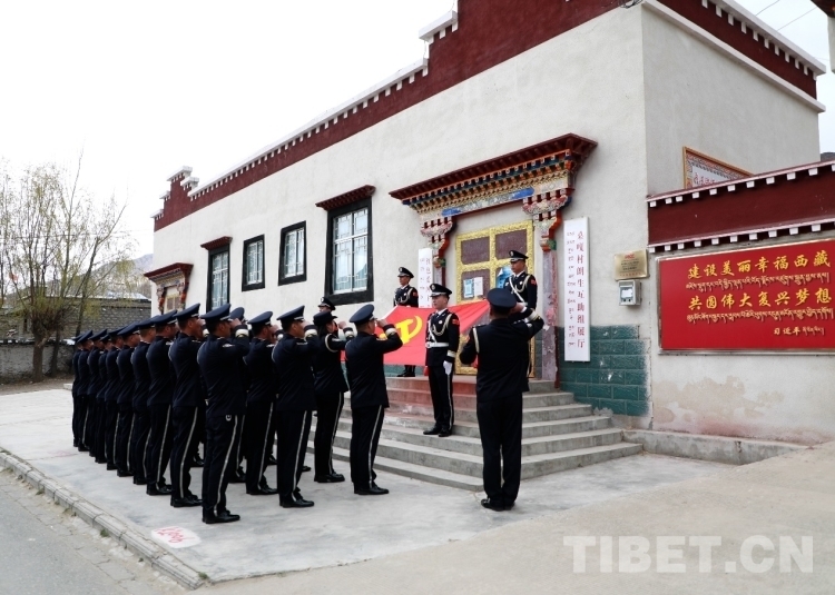 圖為山南邊境管理支隊機關(guān)黨員民警在乃東區(qū)結(jié)巴鄉(xiāng)朗生互助組展廳旁重溫入黨誓詞 攝影:鄭琦山
