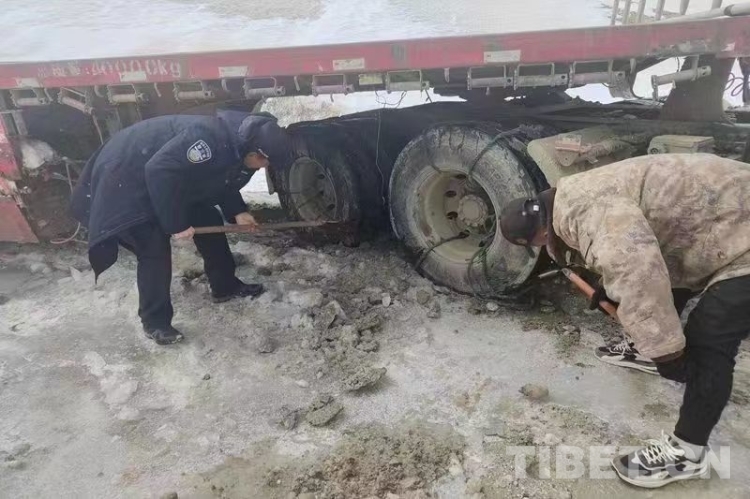 民警抵達(dá)現(xiàn)場,首先確認(rèn)了司機(jī)身體狀況良好。在了解情況后,與司機(jī)共同對車輛開展救援工作。經(jīng)過一段時間努力,仍無法將被困車輛拖離被困地。經(jīng)與司機(jī)協(xié)商決定,先行將其帶至曲松鄉(xiāng)妥善安頓,而后協(xié)調(diào)駐地友鄰單位用重型車輛救援被困車輛。最終在友鄰單位的幫助下,被困近20小時的半掛車成功脫困。