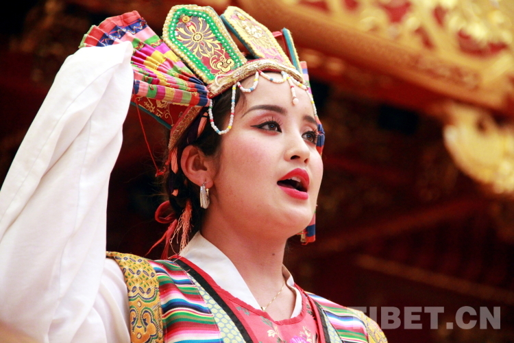 圖為拉薩市城關(guān)區(qū)娘熱民間藝術(shù)團(tuán)演員洛桑卓瑪表演藏戲開(kāi)場(chǎng)《溫巴頓》片段 攝影:劉莉