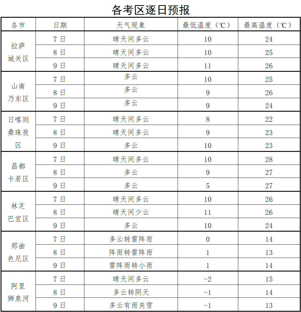 1.高考期間西藏大部無明顯降水,各地氣溫適宜,利于考生應(yīng)考,但晝夜溫差大,請適時增減衣物,白天紫外線強(qiáng),空氣干燥,注意補(bǔ)充水分并做好防曬。