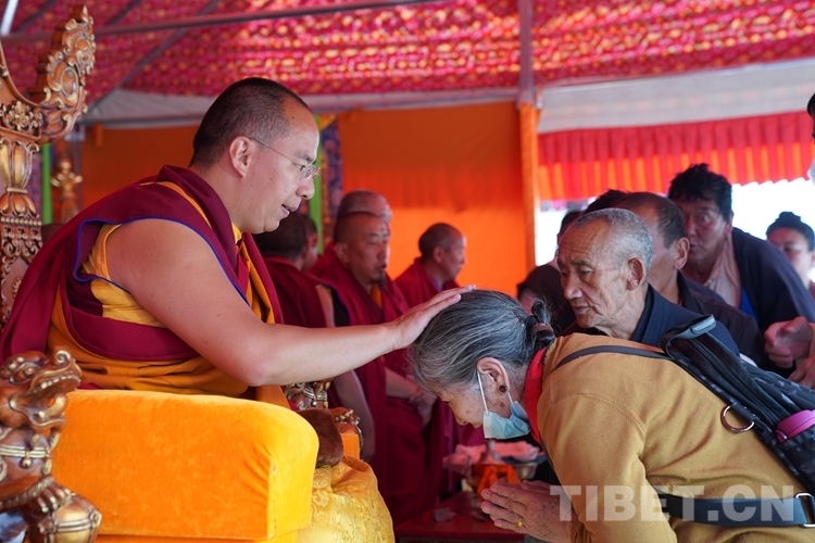禮佛講經(jīng)儀式結(jié)束,班禪來到強巴林寺廣場內(nèi)的法帳中,為廣大信教群眾摸頂賜福。摸頂過程中,班禪不辭辛勞始終口誦經(jīng)文、面帶微笑,當天共計為3.6萬名群眾摸頂,展現(xiàn)出愛國愛教、護國利民的良好風范,贏得了僧俗信眾的廣泛贊譽。