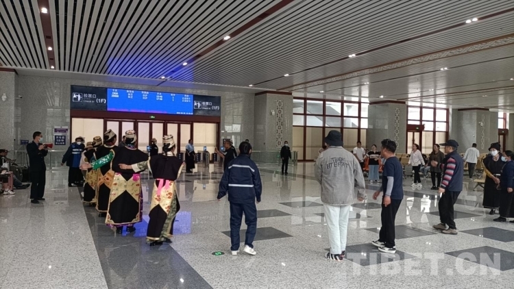 圖為工作人員和旅客跳起歡快的鍋莊舞
