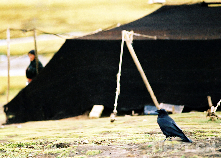 在雙湖辦事處北措折鄉(xiāng)(現(xiàn)雙湖縣措折強瑪鄉(xiāng))一帳篷前,一只烏鴉在漫步(唐召明2001年攝)