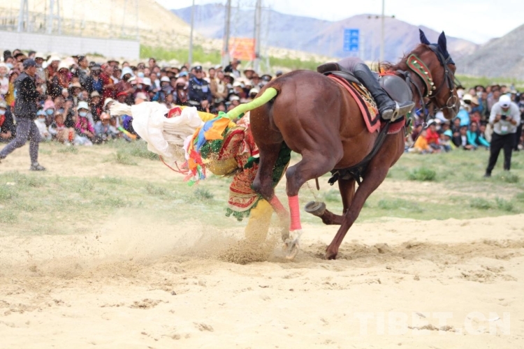賽馬運(yùn)動是藏族群眾十分喜愛的傳統(tǒng)體育運(yùn)動之一,對于藏族人而言,參加賽馬和觀看賽馬能帶來好運(yùn)。下午,來自西藏自治區(qū)馬術(shù)團(tuán)的選手們通過單人單馬、馬上射箭、馬上拾哈達(dá)、馬上敬酒、馬上仰背、多人多馬等表演,呈現(xiàn)了一場激動人心的馬術(shù)表演。表演期間當(dāng)選手們做出高難度的動作時(shí)現(xiàn)場觀眾神情緊張,當(dāng)選手們順利完成表演時(shí),現(xiàn)場高聲叫好、掌聲連連。