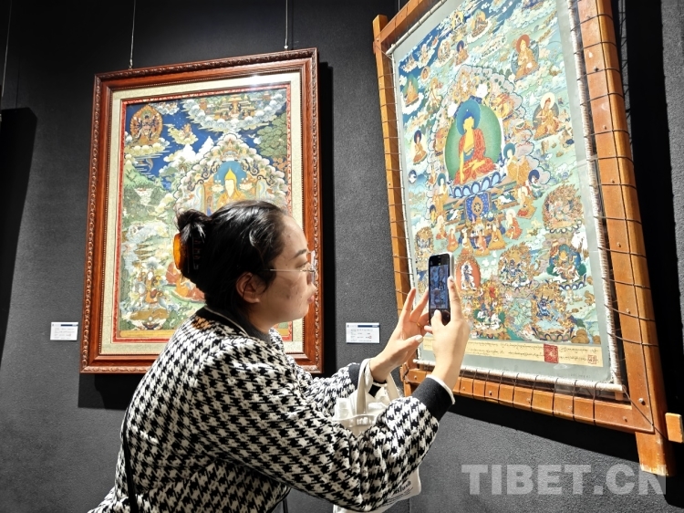 圖為現(xiàn)場觀眾拍攝唐卡作品