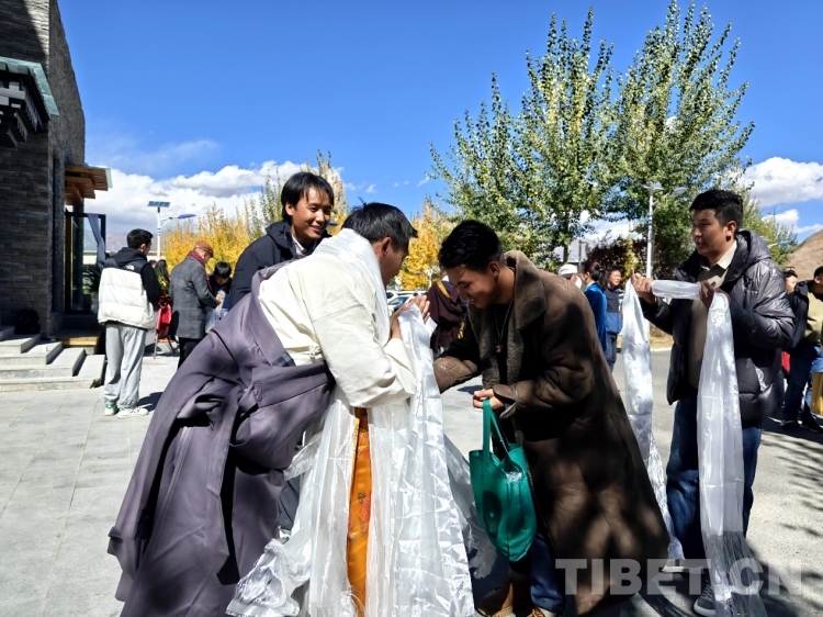 圖為學生們向丹巴繞旦之子、西藏丹巴繞旦唐卡藝術(shù)學校校長旦增平措敬獻哈達,表達對丹巴繞旦教授的敬意