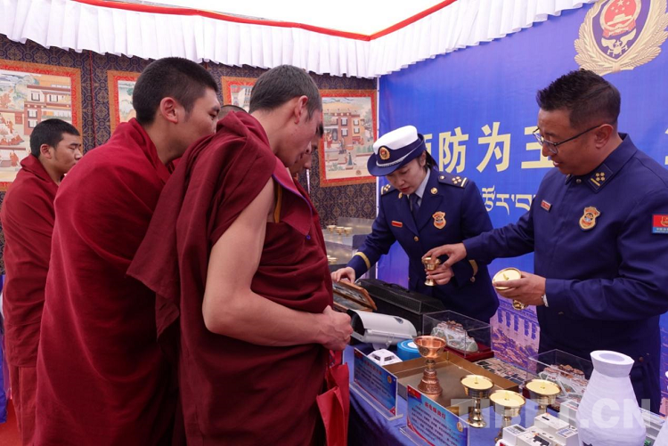 圖為啟動儀式現(xiàn)場拉薩消防指戰(zhàn)員向僧人科普日常寺廟消防安全知識